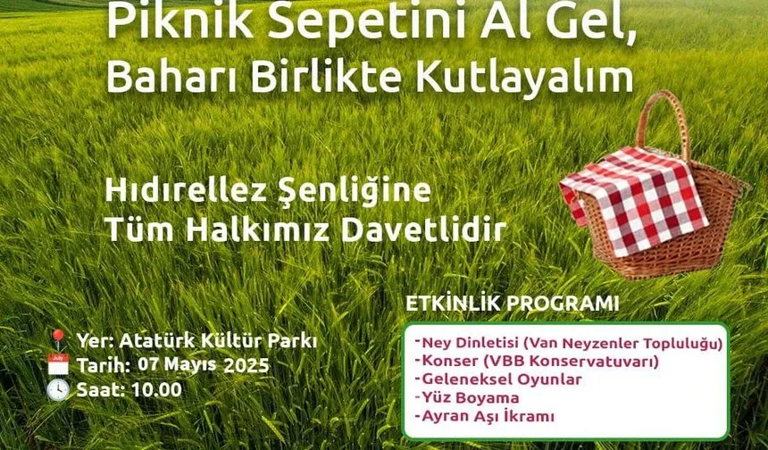 7 Mayıs Çarşamba günü saat 10.00'da; Van Valiliği, Van Büyükşehir Belediyesi ve Milli Eğitim Müdürlüğü tarafından Van Kalesi yanında bulunan Atatürk Kültür Parkı'nda düzenlenecek olan Hıdırellez etkinliğine yoğun katılımın olması bekleniyor.