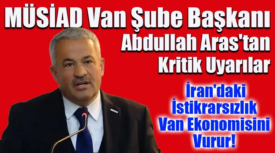 Müstakil Sanayici ve İşadamları Derneği (MÜSİAD) Van Şube Başkanı Abdullah Aras, komşu İran'da yaşanan toplumsal olayların ve istikrarsızlığın, başta Van olmak üzere Türkiye ekonomisi üzerinde ciddi etkileri olabileceğini açıkladı. Aras, İran'ın huzur ve istikrarının Van'ın refahıyla doğrudan bağlantılı olduğunun altını çizdi.