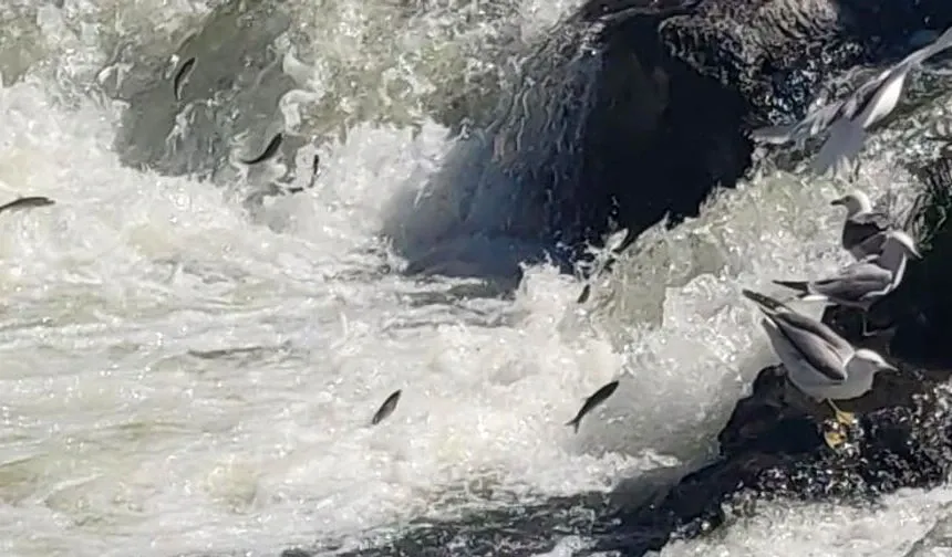 Önüne çıkan engelleri adeta uçarcasına aşan inci kefali, izleyenlere görsel şölen, dere kenarlarına akın eden martılara ise ziyafet sunuyor.