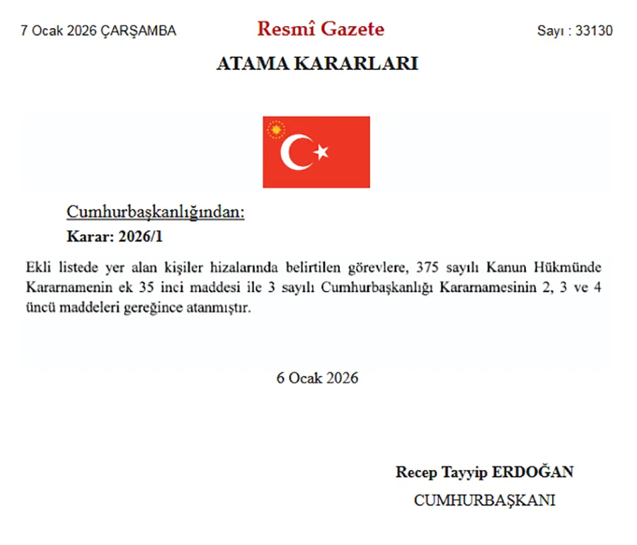 07 Ocak 2026 tarih ve 33130 sayılı Resmi Gazete'de yayımlanan Cumhurbaşkanlığı Atama Kararnamesi ile mülki idarede kapsamlı bir yenilenme yaşandı. Kararname kapsamında, aralarında büyükşehirlerin de bulunduğu toplam 26 ilin valisi değiştirildi. Yeni atanan valilerin görev yerleri ve önceki pozisyonlarına dair detaylı liste kamuoyuna duyuruldu. Bu değişikliklerin, yerel yönetimlerde ve bürokraside yeni bir dönemin başlangıcı olması bekleniyor.