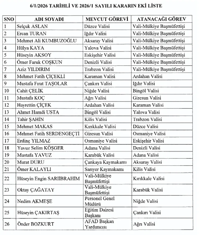 Resmi Gazete'de yayımlanan kararname, Türkiye'nin idari haritasında önemli bir kaymaya işaret ediyor. 26 yeni valinin atanmasıyla birçok ilde yönetim değişirken, görevine devam eden valilerle birlikte süreklilik de korunmuş oldu. Van Valisi Dr. Ozan Balcı örneğinde olduğu gibi, kulis iddialarının her zaman gerçeği yansıtmayabileceği bir kez daha görüldü. Yeni atanan valilerin, bulundukları illerde hizmet ve kalkınma süreçlerine nasıl katkı sağlayacağı ise zamanla belli olacak.