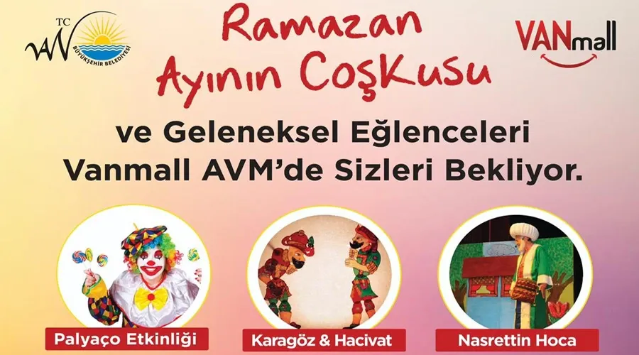 Van Büyükşehir Belediyesi'nin katkılarıyla VanMall AVM'de düzenlenecek ücretsiz Ramazan etkinlikleri, 28 Şubat'ta başlıyor. Palyaço gösterileri, Karagöz-Hacivat, tiyatro ve çocuk aktivitleriyle dopdolu bir program sizleri bekliyor.