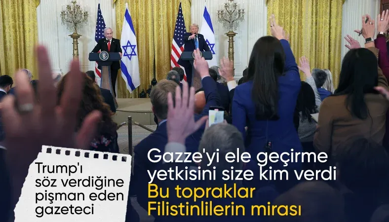 ABD’li gazeteci Trump’a "ABD’nin egemen bir bölgeyi ele geçirmesinden bahsediyorsunuz. Hangi yetki bunu yapmanıza izin veriyor? Sayın Başkan, bu fikri İsrail’in sınırlarını genişletmeyi, barışa sahip olma yolu mu görüyorsunuz?" sorularını yöneltti.