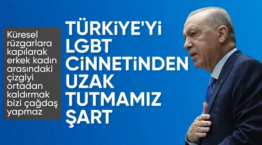 Burada açıklamalarda bulunan Cumhurbaşkanı Erdoğan, LGBT sapkınlığına dikkat çekerek, Türkiye'nin bu sapkınlıkla mücadelenin bayraktarlarından biri olacağını belirtip, "Erkek ile kadın arasındaki çizgiyi kaldırmak bizi çağdaş yapmaz, küreselcilerin oyuncağı yapar" ifadesinde bulundu.