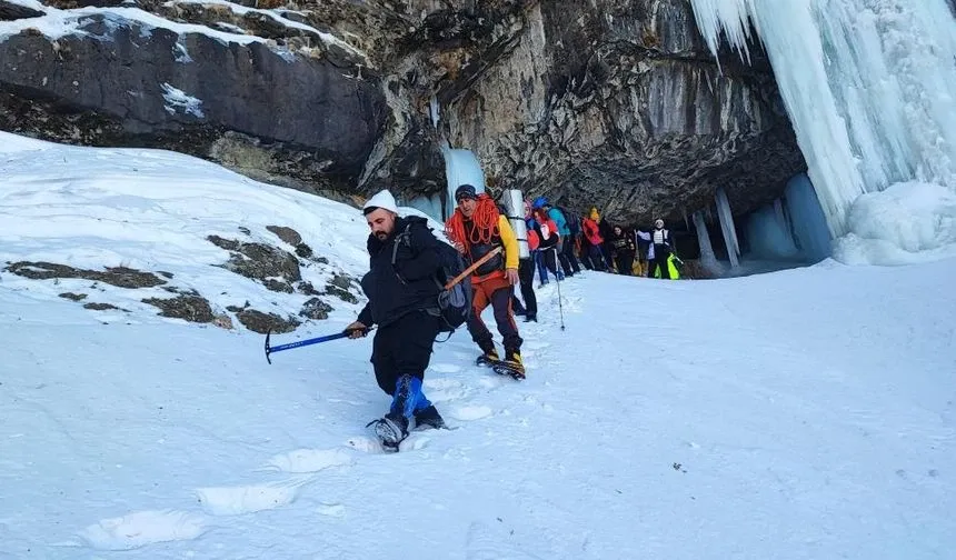 Vadi Doğa Sporları Kulübü üyesi 15 dağcı, yaklaşık 3 saat süren zorlu tırmanışla karla kaplı 3 bin 204 rakımlı Erek Dağı'ndaki şelale ve buz sarkıtlarının bulunduğu mağaraya ulaştı.