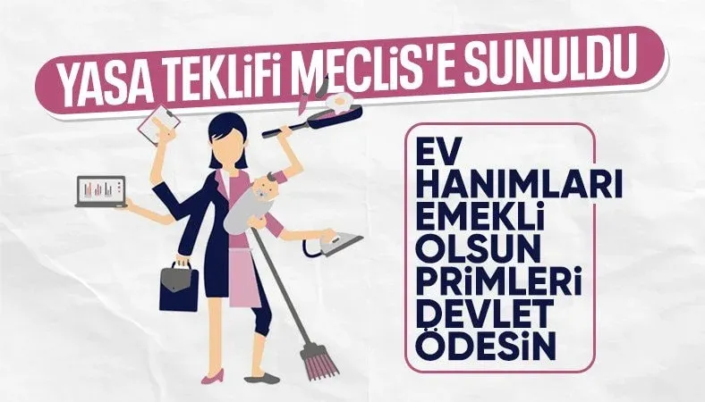 Türkiye Büyük Millet Meclisi’ne sunulan kanun teklifine göre, herhangi bir geliri bulunmayan ev hanımlarının sosyal güvenlik sistemi içine dahil edilmesi ve sigorta primlerinin devlet bütçesinden karşılanması öngörülüyor.