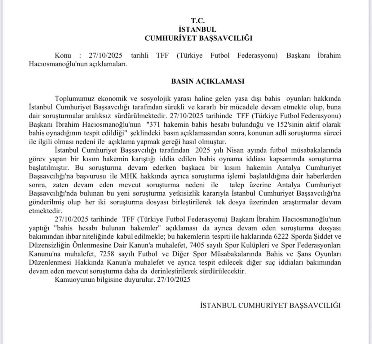 "İstanbul Cumhuriyet Başsavcılığı tarafından 2025 yılı Nisan ayında futbol müsabakalarında görev yapan bir kısım hakemin karıştığı iddia edilen bahis oynama iddiası kapsamında soruşturma başlatılmıştır.