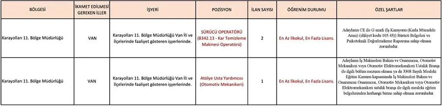 Karayolları 11. Bölge Müdürlüğü, Van'da Otomotiv Mekanikeri ve Kar Temizleme Makinesi Operatörü pozisyonlarında 3 sürekli işçi alımı yapacak. Eski hükümlü veya TMY statüsündeki adaylar için başvurular 08-12 Aralık 2025 tarihleri arasında İŞKUR'a yapılacak.