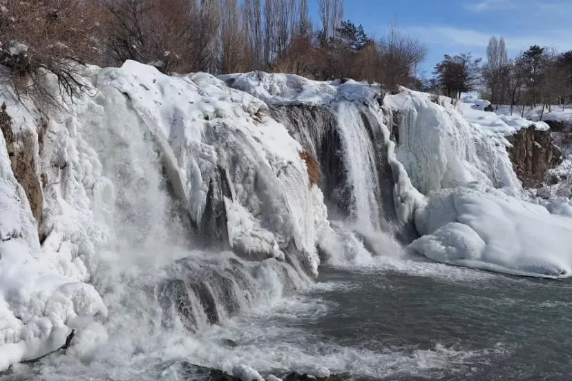 Van’ın doğa harikası Muradiye Şelalesi, dondurucu soğukların ardından adeta bir masal diyarına dönüştü. Hava sıcaklığının sıfırın altına düşmesiyle birlikte şelale buz tutarken, çevresini saran kar örtüsüyle ortaya çıkan manzara ’beyaz gelinlik’ yakıştırmasını bir kez daha haklı çıkardı. Her mevsim binlerce turisti ağırlayan Muradiye Şelalesi, kış mevsiminin gelişiyle birlikte büyüleyici bir görünüme büründü. Bölgede etkili olan kar yağışı ve dondurucu soğuklar, yaklaşık 20 metre yükseklikten akan suları kısmen dondurarak dev buz sarkıtları oluşturdu.