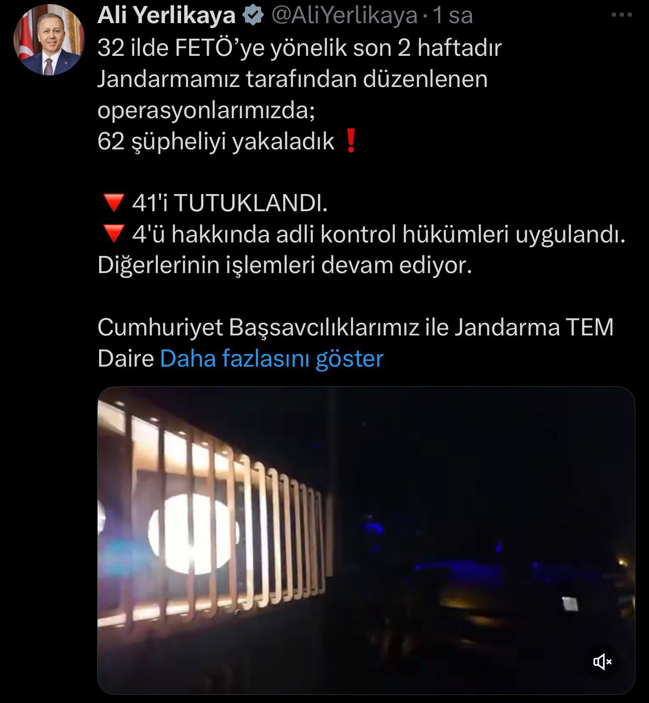 "32 ilde FETÖ’ye yönelik son 2 haftadır jandarmamız tarafından düzenlenen operasyonlarımızda 62 şüpheliyi yakaladık. 41'i tutuklandı. 4'ü hakkında adli kontrol hükümleri uygulandı. Diğerlerinin işlemleri devam ediyor. Cumhuriyet Başsavcılıklarımız ile Jandarma TEM Daire Başkanlığımız koordinesinde, İl Jandarma Komutanlıklarınca; Adana, Adıyaman, Aksaray, Amasya, Ankara, Antalya, Aydın, Burdur, Bursa, Çanakkale, Diyarbakır, Edirne, Elazığ, Erzurum, Eskişehir, Hatay, İstanbul, İzmir, Kahramanmaraş, Kırıkkale, Konya, Kütahya, Manisa, Mersin, Muğla, Samsun, Siirt, Sivas, Şanlıurfa, Tokat, Uşak ve Van'da düzenlenen operasyonlarda yakalanan şüphelilerin terör örgütünün güncel yapılanması içerisinde faaliyet yürüttükleri, ankesörlü telefonlarla örgüt içerisinde sorumlu şahıslarla irtibatta bulundukları, terör örgütüyle iltisaklı sözde yardım kuruluşlarına finans sağladıkları ve sosyal medya hesapları üzerinden FETÖ’nün propagandasını yaptıkları tespit edildi. Savcılıklarımızca haklarında soruşturma başlatıldı. Emeği geçenleri tebrik ediyorum."