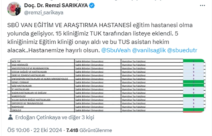 Sağlık Bilimleri Üniversitesi (SBÜ) Van Eğitim ve Araştırma Hastanesi'nde önemli bir gelişme yaşandı. Hastanenin 15 kliniğinin Tıpta Uzmanlık Kurulu (TUK) listesine girebildiği ve bu kliniklerden 5'inin eğitim kliniği onayı alarak Tıpta Uzmanlık Sınavı (TUS) kapsamında asistan hekim alımı yapacağı açıklandı.
