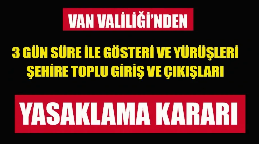 Van'da , vatandaşların can ve mal güvenliğinin sağlanması, terör örgütleri tehditlerinin bertaraf edilmesi ve genel asayişin korunması amacıyla, üç gün boyunca gösteri, toplantı ve şehre toplu giriş ve çıkışlar yasaklandı.