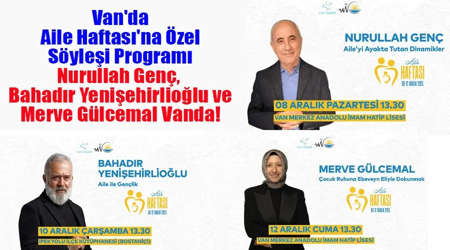 Van Valiliği ve Van Büyükşehir Belediyesi, 08-12 Aralık Aile Haftası kapsamında birbirinden değerli isimlerin katılımıyla söyleşi programı düzenliyor. Nurullah Genç, Bahadır Yenişehirlioğlu ve Merve Gülcemal'ın konuşmacı olacağı etkinlikler, Van Merkez Anadolu İmam Hatip Lisesi ve İpekyolu İlçe Kütüphanesi'nde ücretsiz gerçekleşecek.