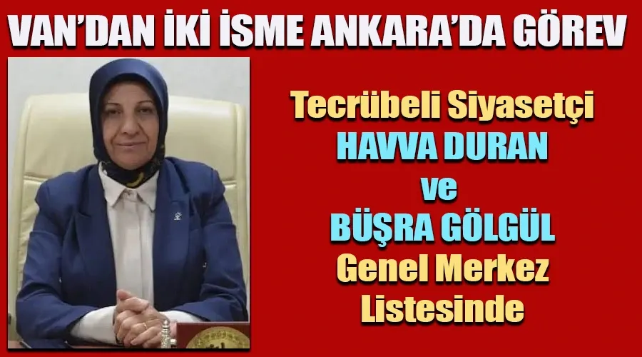 Önceki dönem Van Kadın Kolları İl Başkanı olan Havva Duran’a Ankara’da görev verildi. Görevi devralan Genel Başkan Tuba Işık Ercan, geçmiş hizmetlerini ve tecrübelerini dikkate aldığı Havva Duran’a, MKYK listesinde üyeler arasında yer verdi.